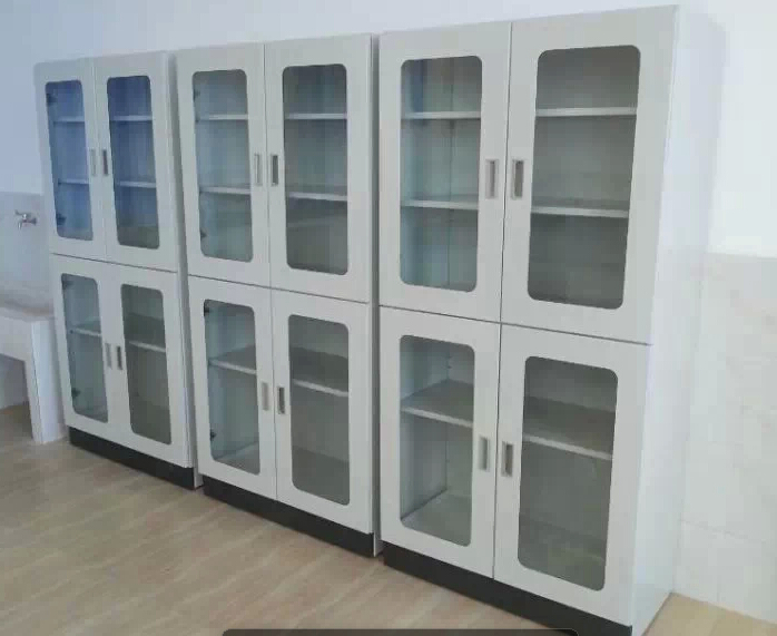 采用宝钢产1.2mm优质冷轧板钢板折弯、冲压而成,表面经酸洗、磷化厚经采用1600目环氧树脂干粉EPOXY喷涂处理,其厚度最少为15mils;以适用于实验室环境,上下门板中间镶嵌5mm厚玻璃,,内置多层活动层板,高低可调节;铰链:采用DTC全开不锈钢铰链;拉手:实验室专用铝合金暗拉手或冷轧钢板折弯一次成型拉手;地脚:采用不锈钢与高强尼龙组合地脚承重、防潮、防滑、抑菌、耐腐蚀,可根据室内地坪适当调整高度,可调高度050mm